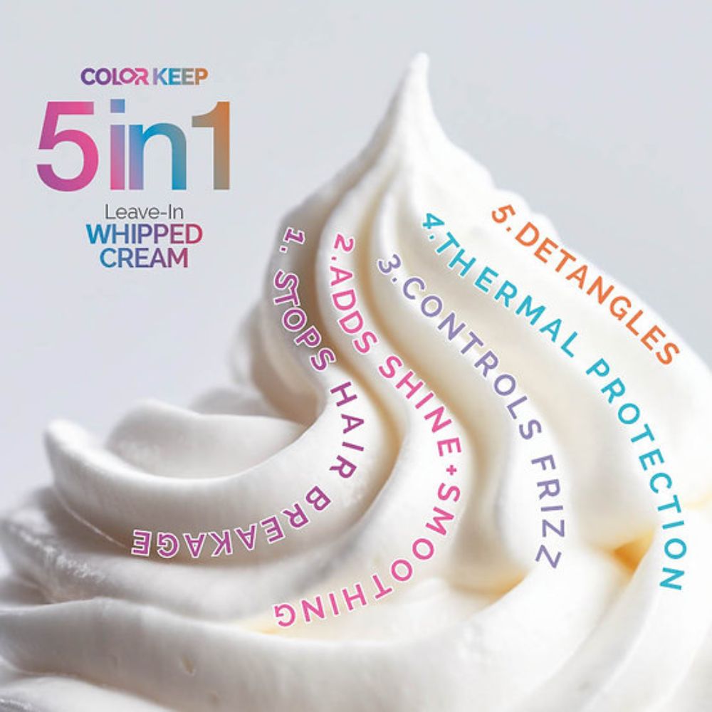 for colored hair. A revolutionary, high performing, luxury whip that offers 5 benefits in 1. Hair cuticles are the first line of defense for maintaining long lasting color and providing protection from external elements. Color Keep 5 in 1 Leave-In Whipped Cream is designed to provide outstanding protection and longevity to color treated hair by maintaining a healthy cuticle surface. Infused with Amino Acids, Keratin, Argan Oil, Hyaluronic Acid, and Collagen, this luxurious formula provides a protective shield and works to maintain a healthy hair surface thus providing longer lasting color.